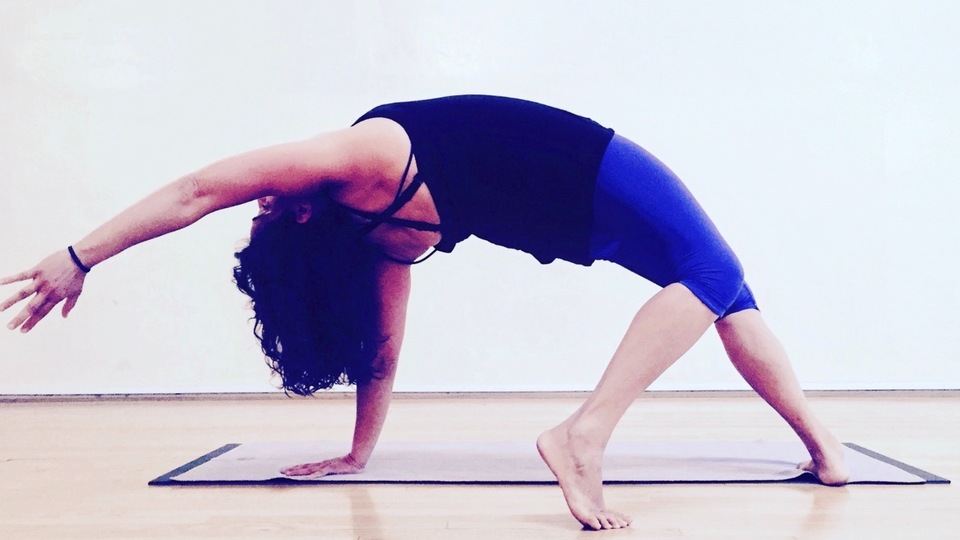 Wild Thing's what we commonly call this shape. Some call it rock star pose. Its Sanskrit name is Camatkarāsana meaning "the ecstatic unfolding of the enraptured heart".